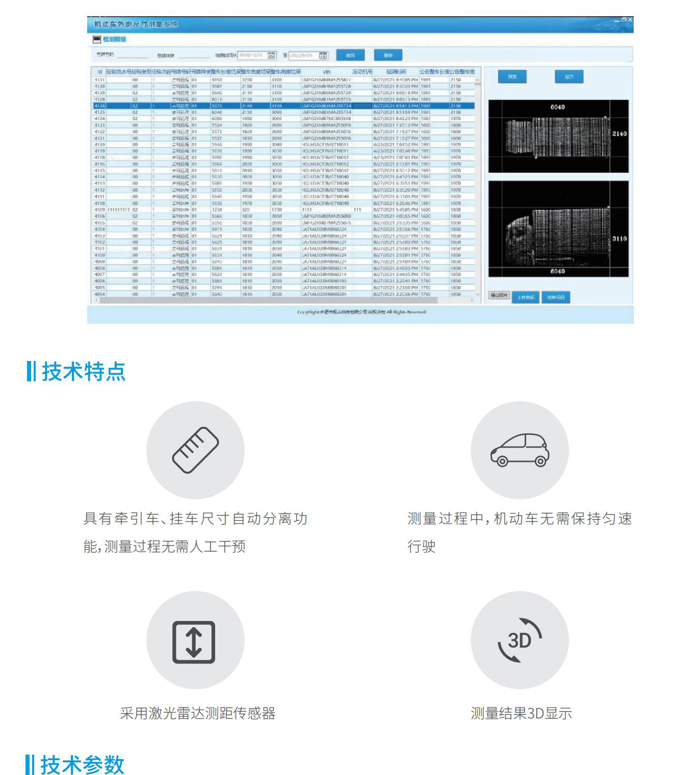 汽車(chē)外廓尺寸自動(dòng)測(cè)量?jī)x采用通過(guò)中途不停車(chē)的方式對(duì)機(jī)動(dòng)車(chē)的長(zhǎng)、寬、高、軸距等尺寸進(jìn)行檢測(cè)。